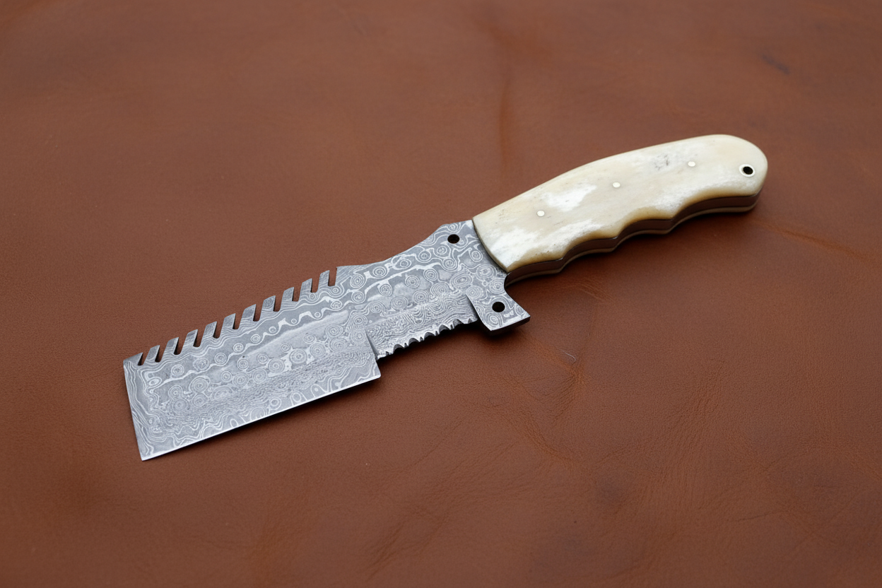 Expertly hand-forged Damascus steel with layered patterns for sharpness and durability. Bone-and-wood handles offer strength, comfort, and unique character.