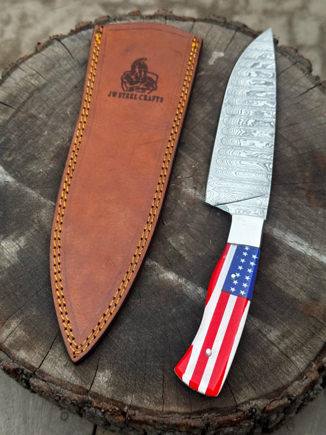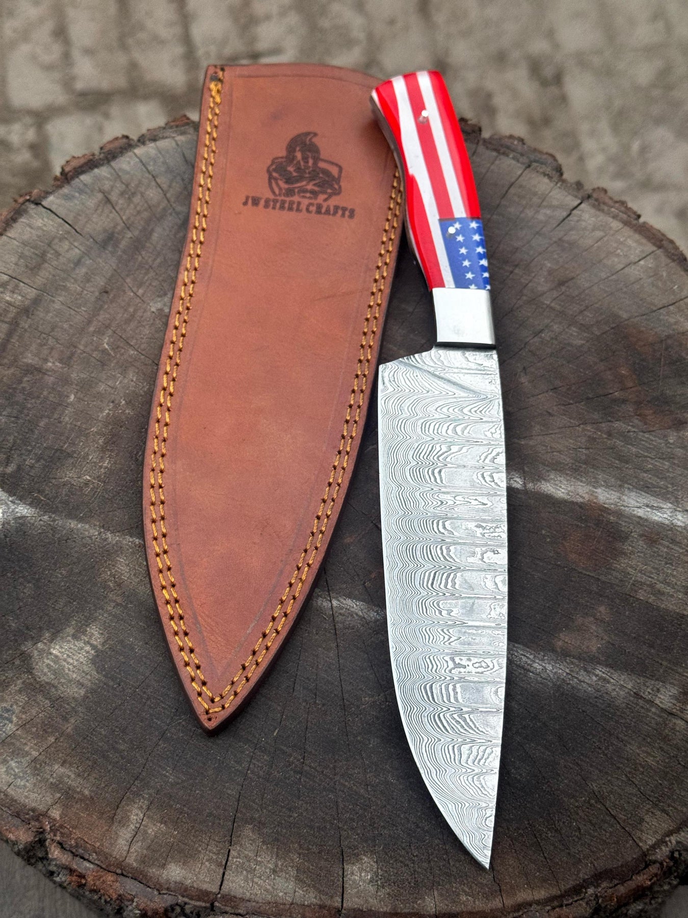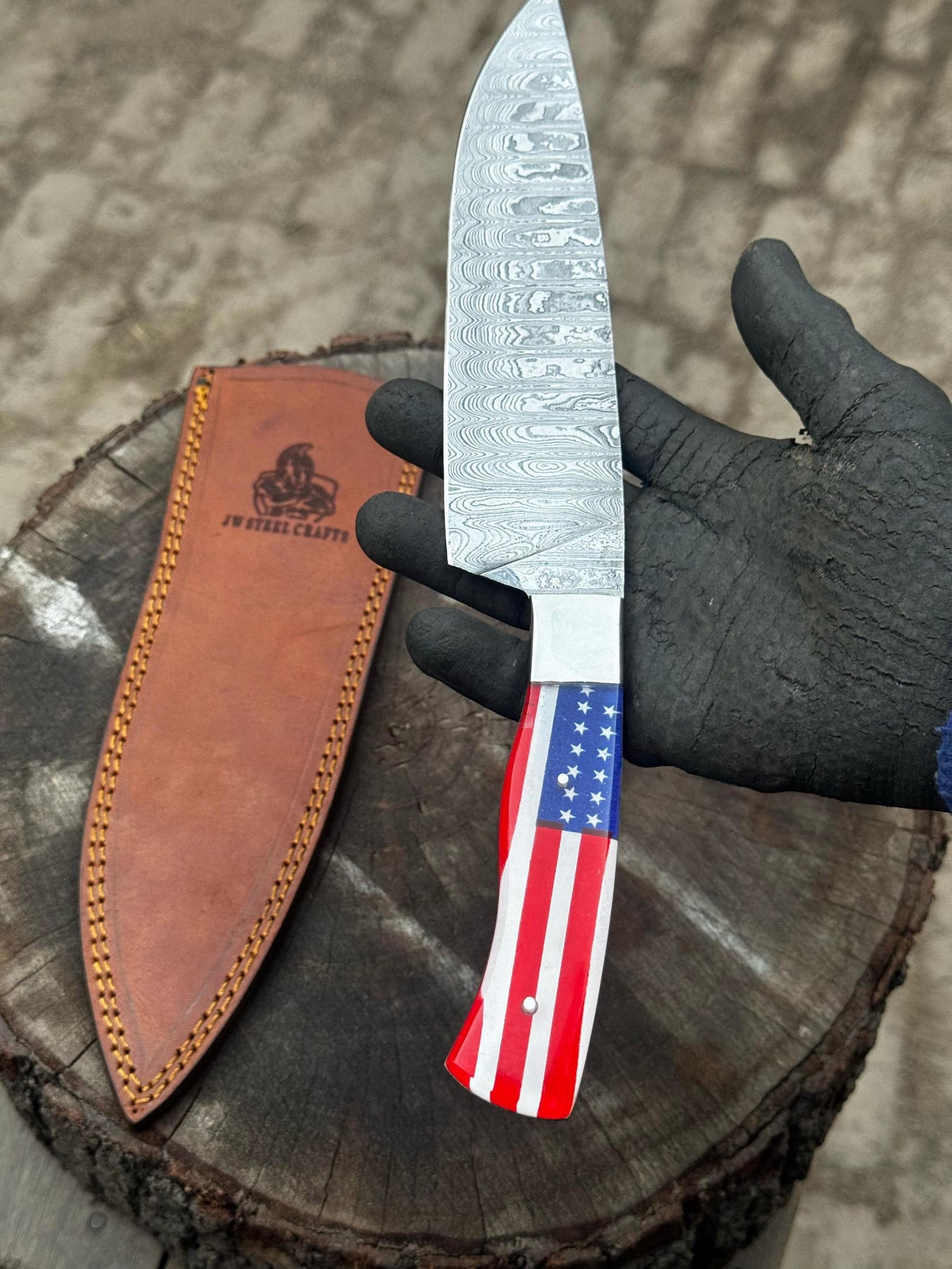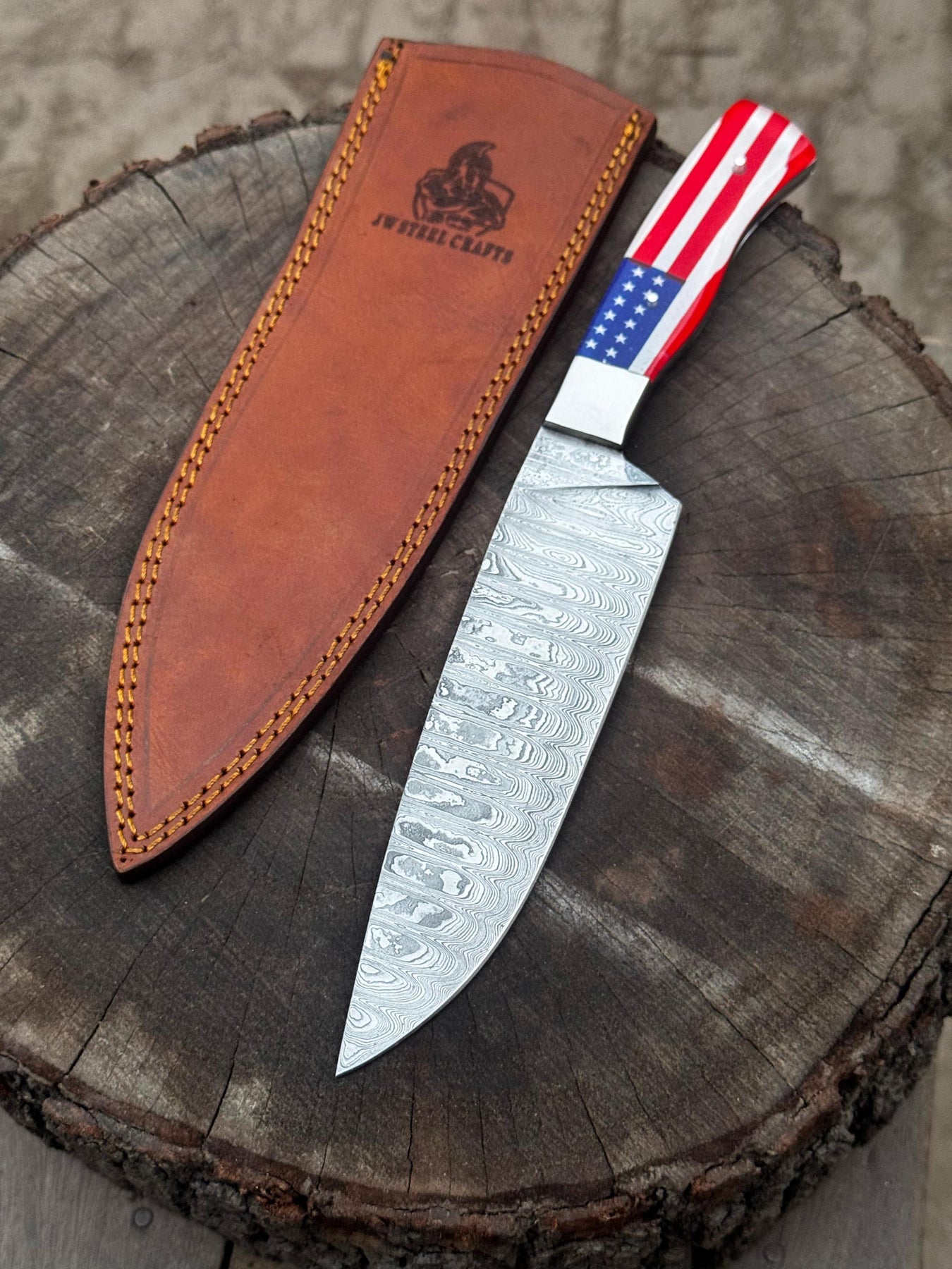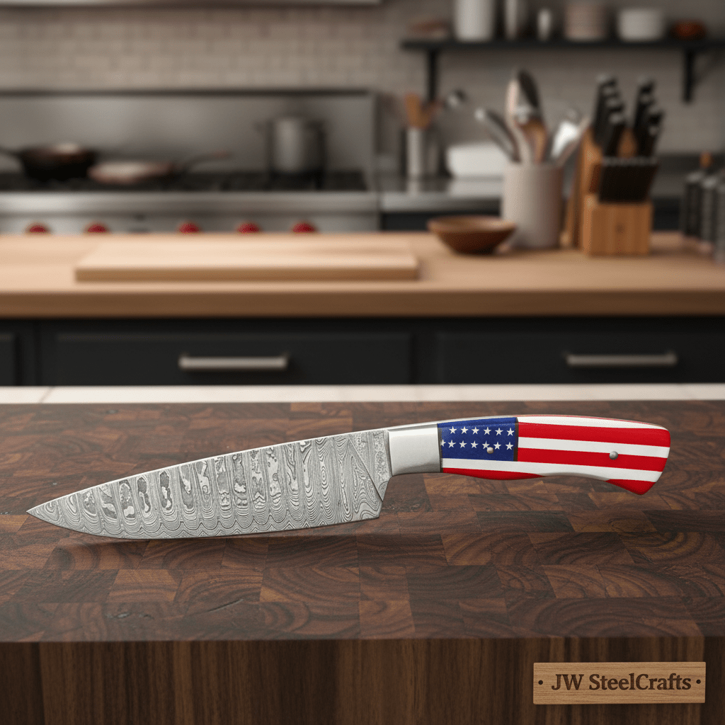 Damascus Steel Chef Knife with USA Flag Handle | Handmade Kitchen Knife