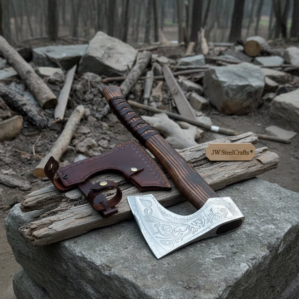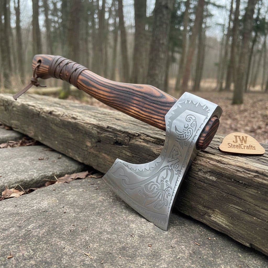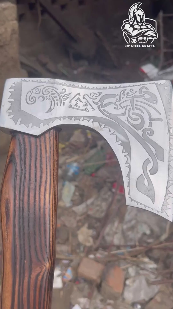This hand forged Viking axe combines traditional Nordic design with modern precision finishing. JW SteelCrafts forges each carbon steel head to deliver strength, edge stability, and reliable cutting performance. The engraved blade surface reflects classic Viking artistry while maintaining full field functionality.