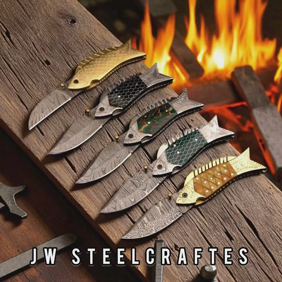 Bring craftsmanship and creativity together with JW SteelCrafts’ exclusive Damascus Fish Folding Knife Collection — each knife hand-forged from premium Damascus steel and designed with a unique fish-shaped handle for collectors, outdoor lovers, and gifting occasions.
