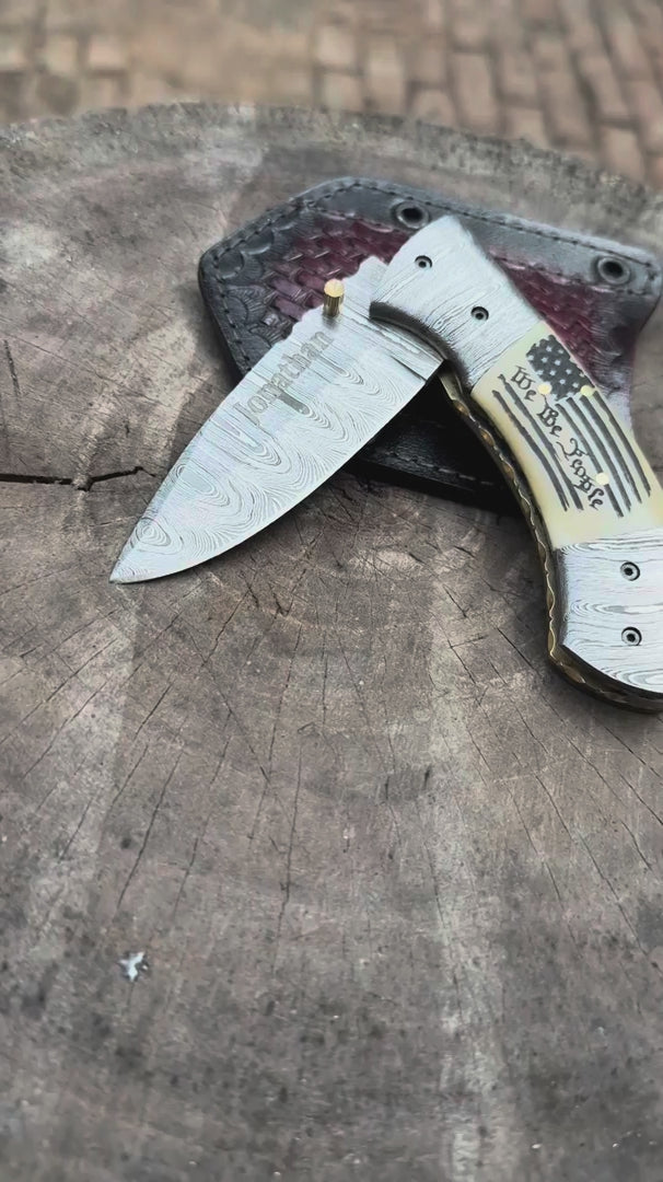 Celebrate craftsmanship and freedom with this hand-forged Damascus folding knife by JW Steel Crafts. Meticulously crafted from high-quality Damascus steel, this knife features a stunning “We The People” engraving on a custom bone handle and a precision-folding design built to last.