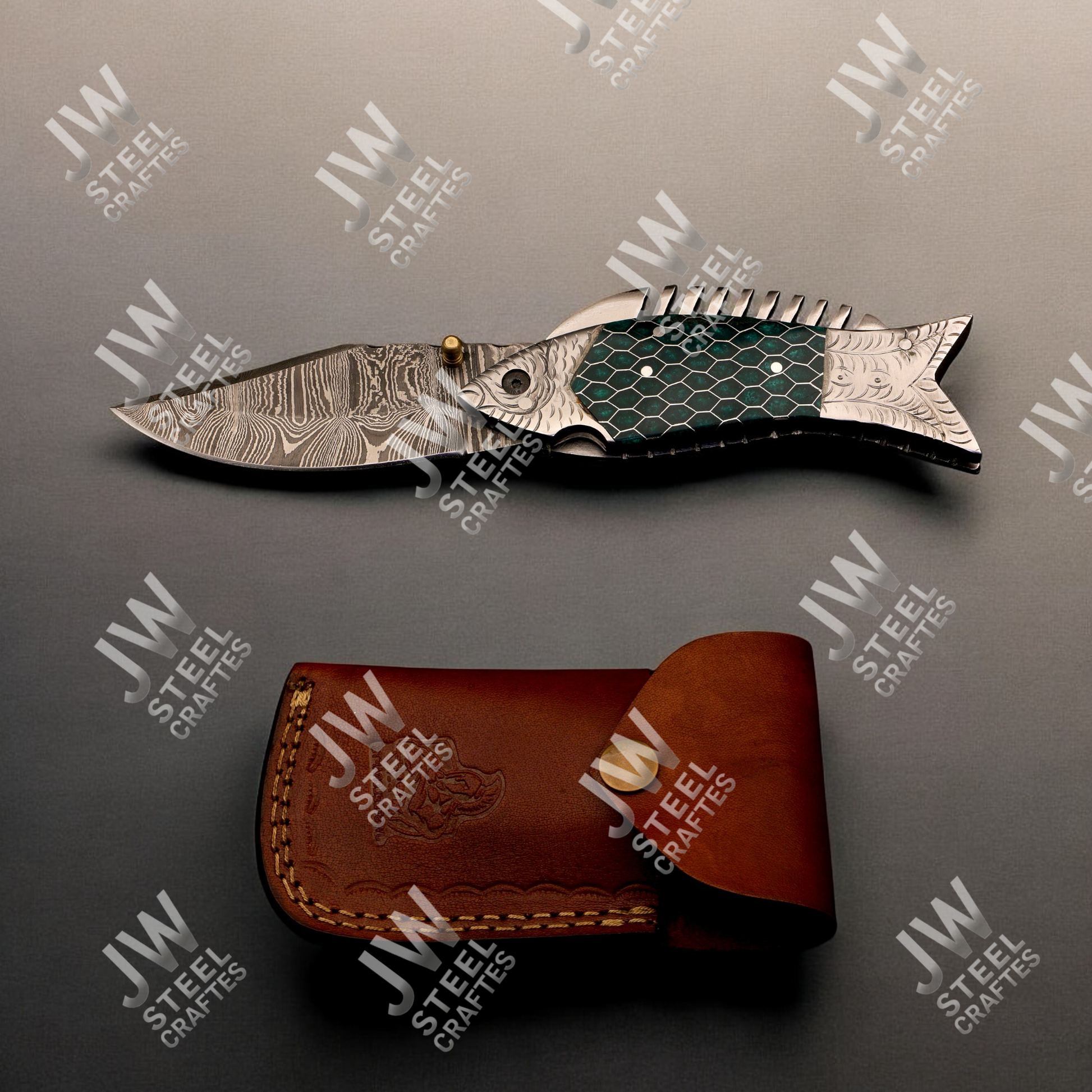 Hand-Forged Damascus Steel Folding Knife – Green Honeycomb Resin Fish Handle with Leather Sheath | Custom Collectible Gift