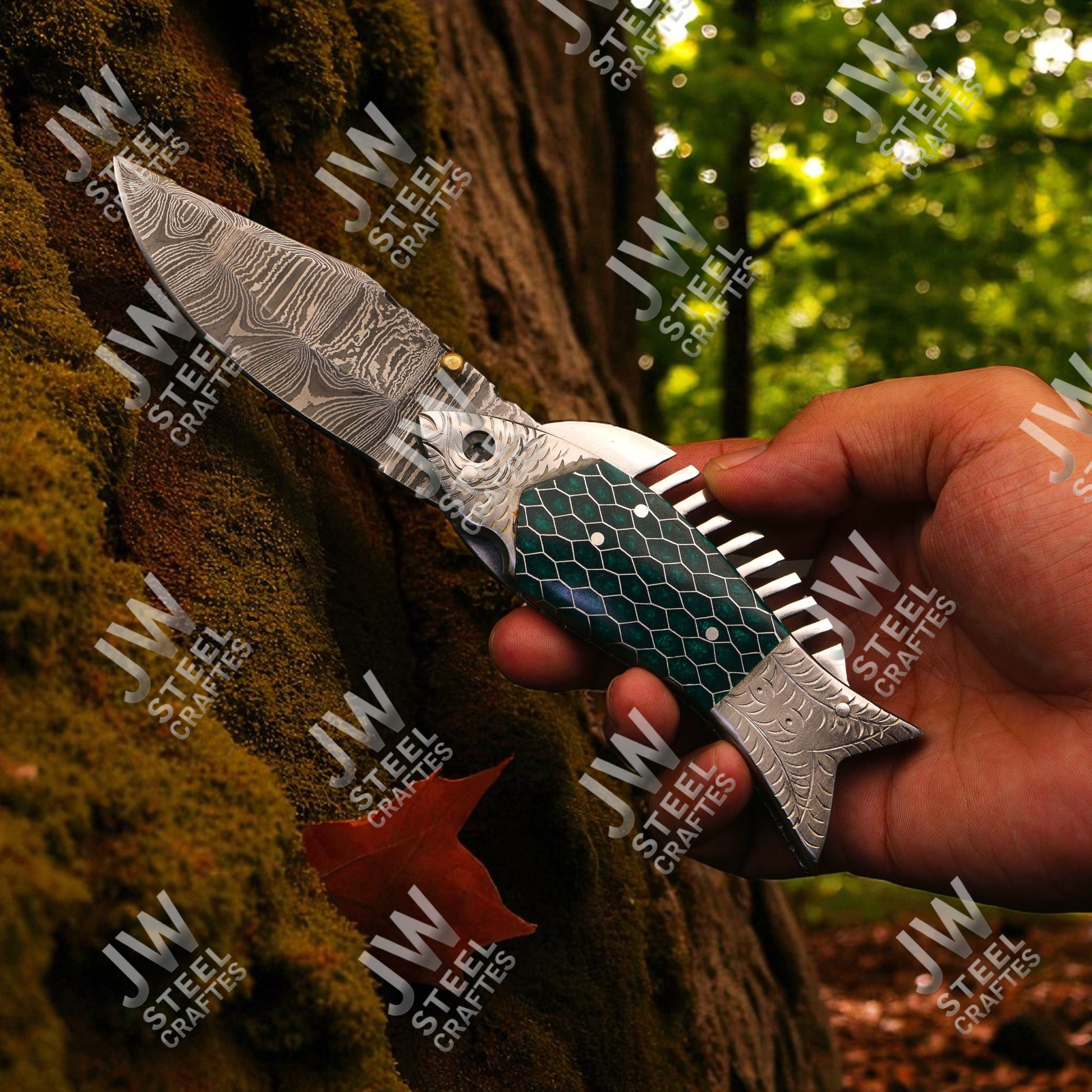 Art meets engineering in this hand-forged Damascus folding knife — featuring a fish-inspired design and a striking green honeycomb resin handle.