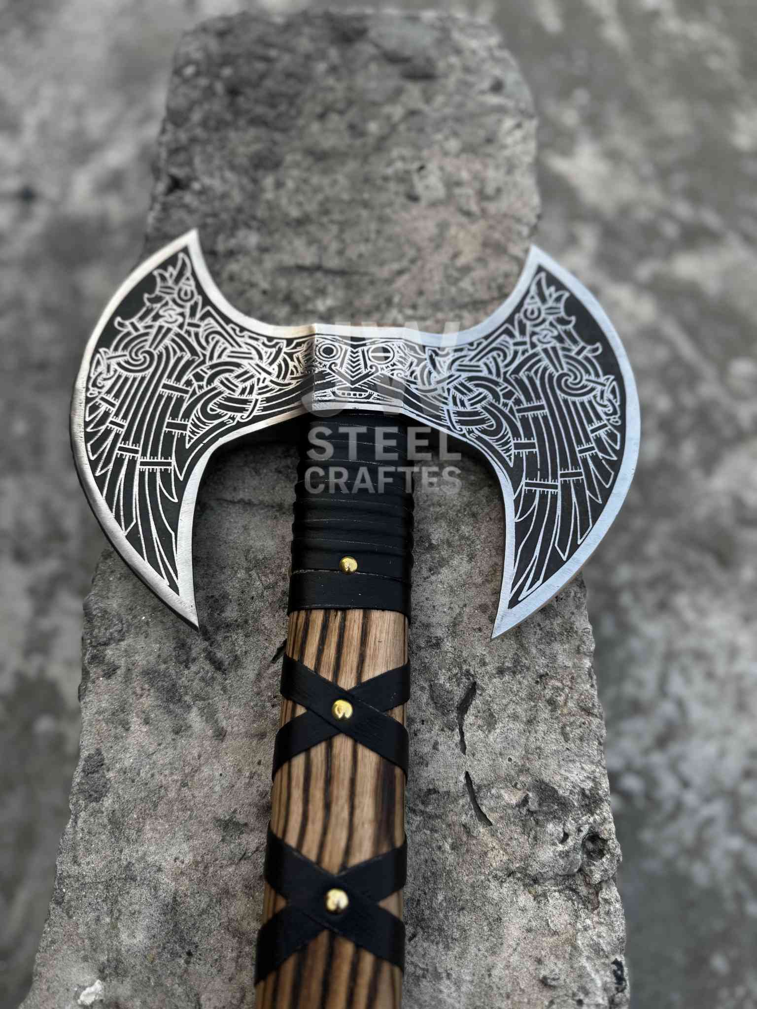 Hand Forged Double-Headed Viking Axe – Norse Engraved Battle Axe with Wooden Handle