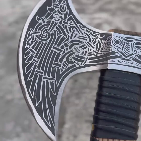 Channel the strength of the Vikings with this hand-forged double-headed Viking axe, designed with detailed Norse knotwork engravings. Each axe is a collectible piece of craftsmanship, featuring a steel double blade, a solid wooden handle wrapped with leather, and symbolic etchings inspired by Norse mythology.