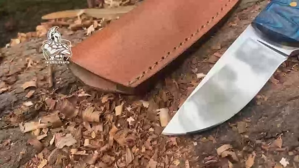 Hand Forged J2 Stainless Steel Skinner Knife with Blue Pakka Wood Handle & Leather Sheath – Hunting, Camping, EDC
