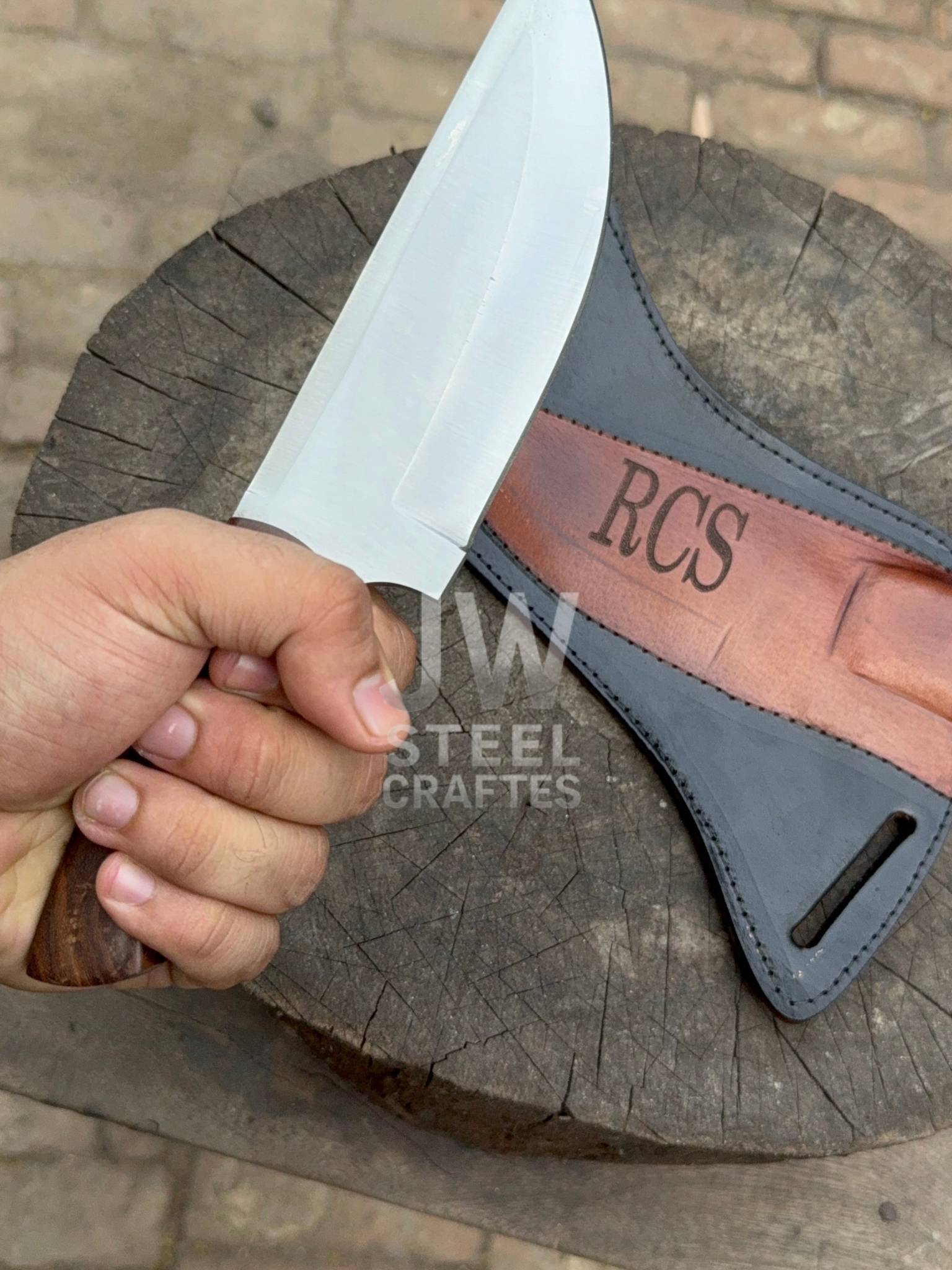 Experience compact power with JW SteelCrafts’ Handmade Damascus Skinner Knife. A razor-sharp layered Damascus blade pairs with a polished bull horn handle and brass pins for strength, balance, and control. Includes a hand-stitched leather sheath for safe carry.