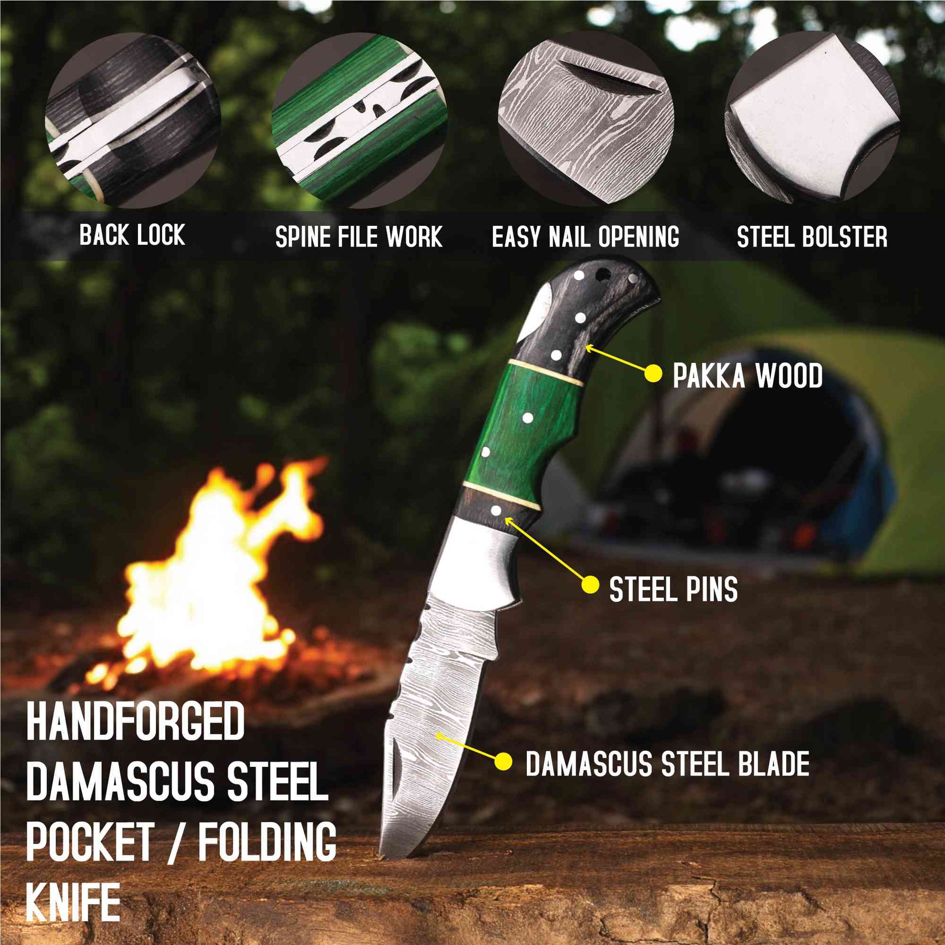 Handmade Damascus Steel Folding Knife – Blue & Black Handle with Leather Sheath