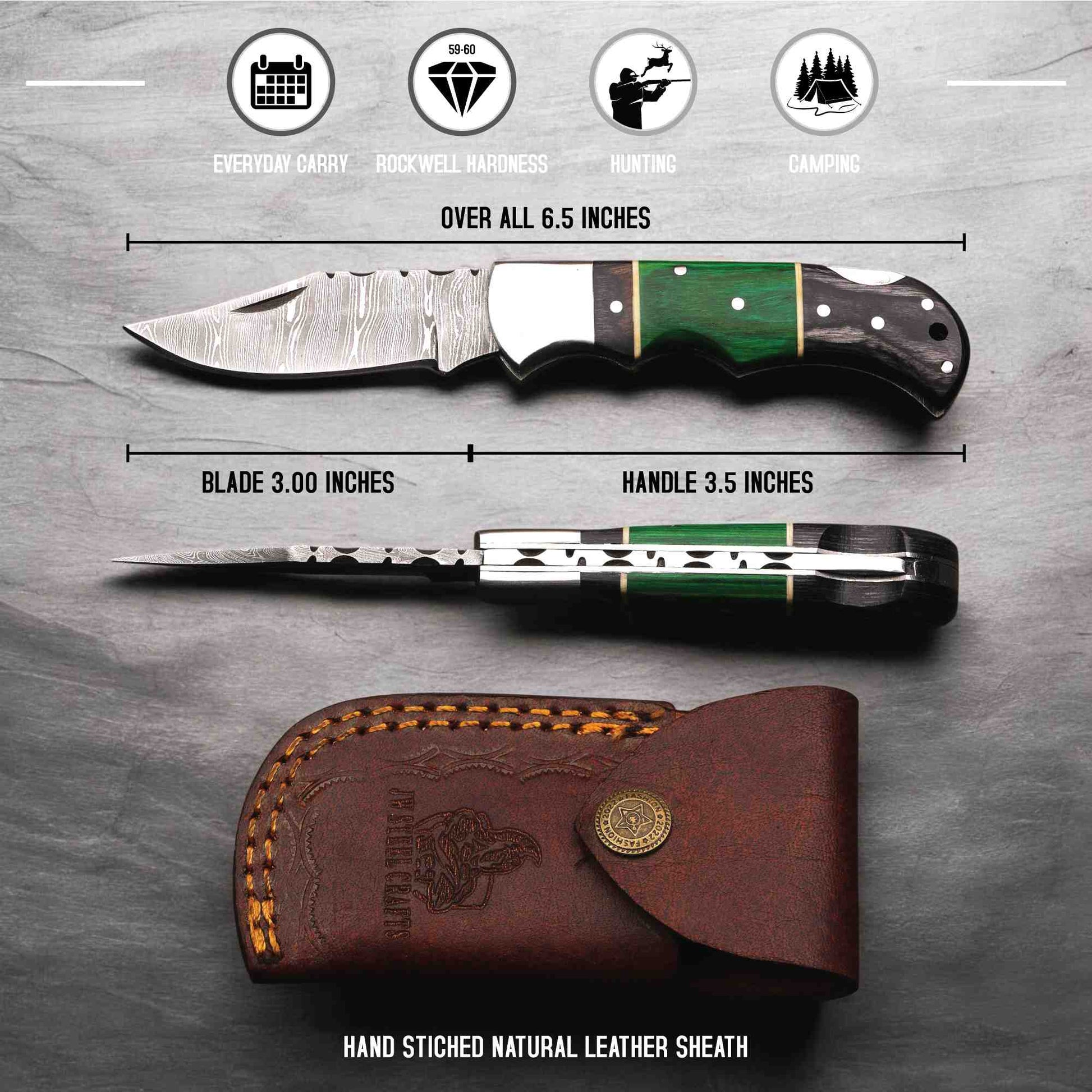 Handmade Damascus Steel Folding Knife Blue & Black Handle Leather Sheath Pocket Knife, EDC Camping Gift, Groomsmen Gift ,Gift for her
