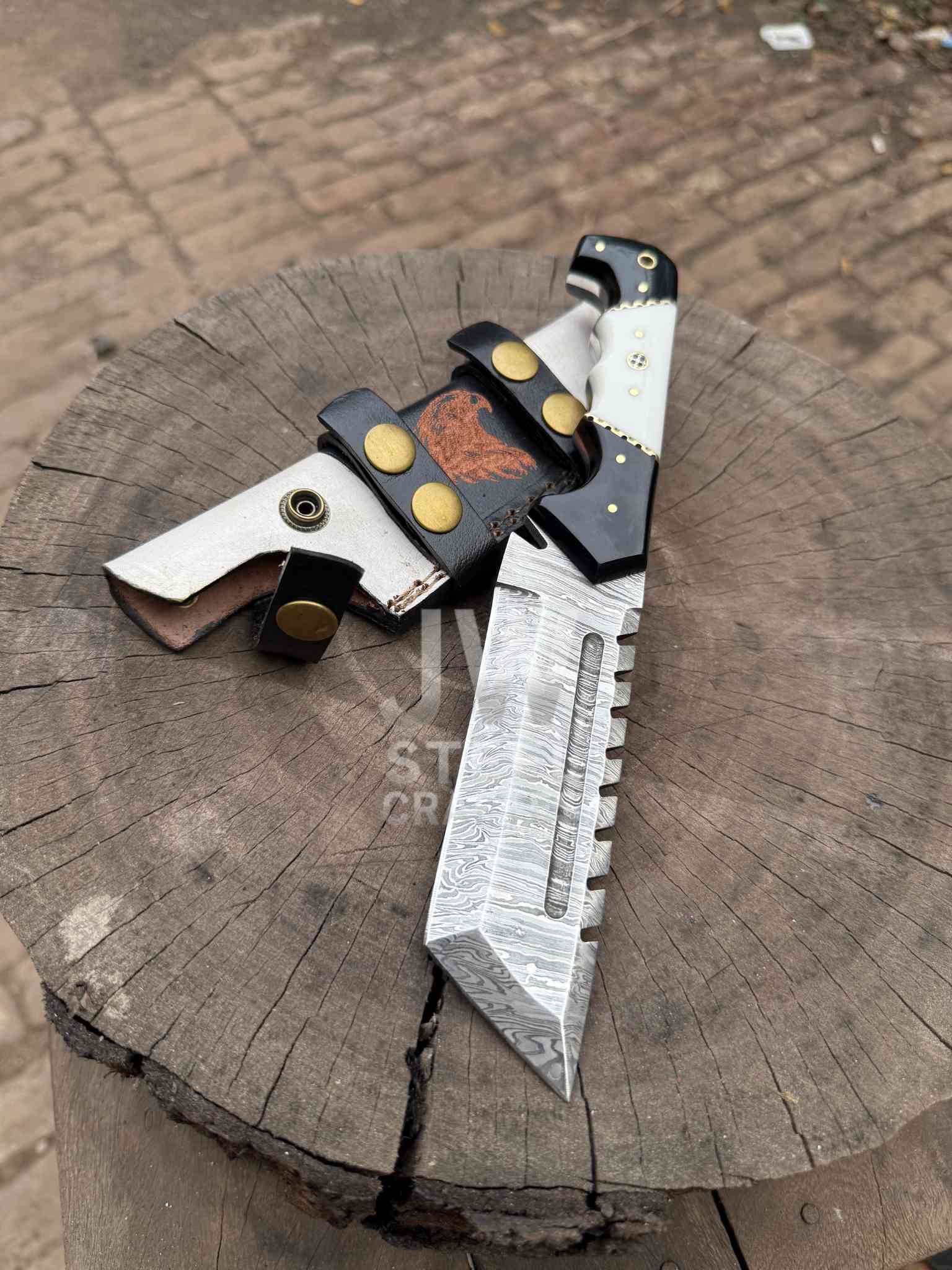 Handmade Damascus Tanto Knife – Black & White Handle with Wolf engraved Leather Sheath
