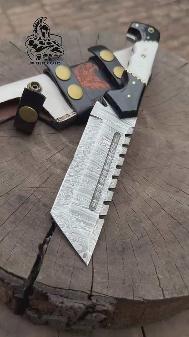 Add a bold edge to your collection with JW SteelCrafts’ Handmade Damascus Tanto Knife. The razor-sharp tanto style blade is hand-forged from layered Damascus steel, featuring unique wave patterns and saw-back design for a striking look.
