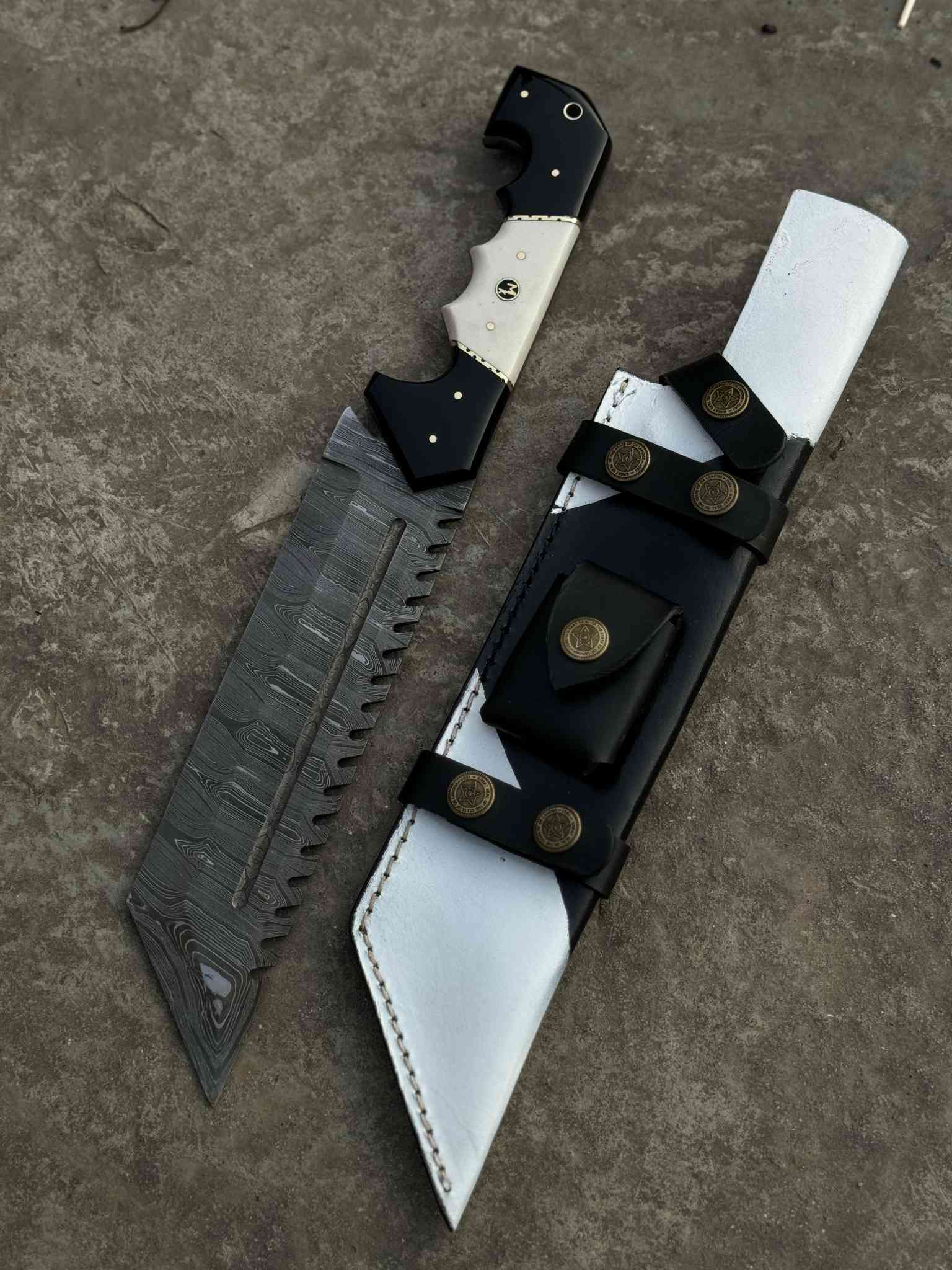 13.5" Handmade Damascus Tracker Knife – Black & White Resin Handle, Hunting Survival Blade with Leather Sheath | Personalized Gift for Him
