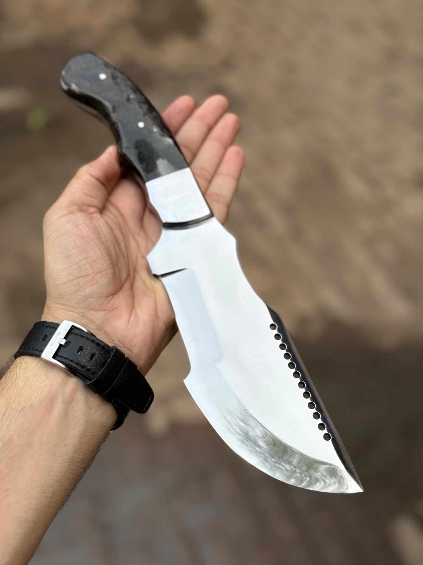 A: This is a fully functional working knife, forged to be used for camping, hunting and general outdoor tasks. Many customers also buy it as a showpiece because of the unique handle and blade shape.