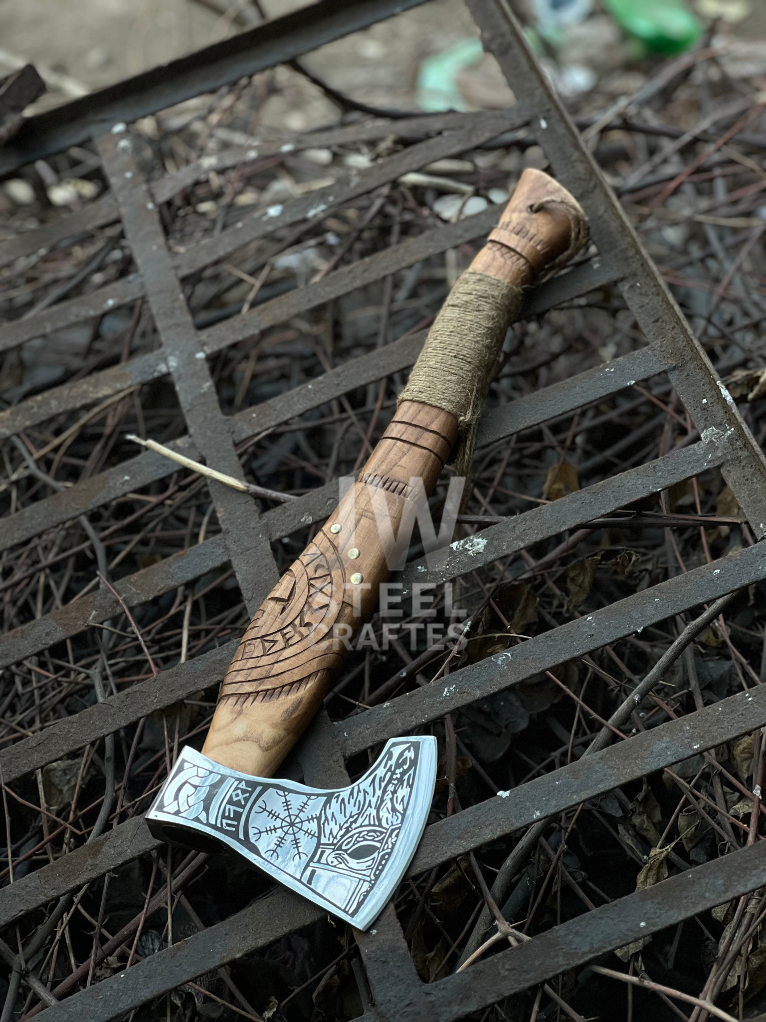 Handmade Viking Axe – Engraved Steel Head with Carved Wooden Handle