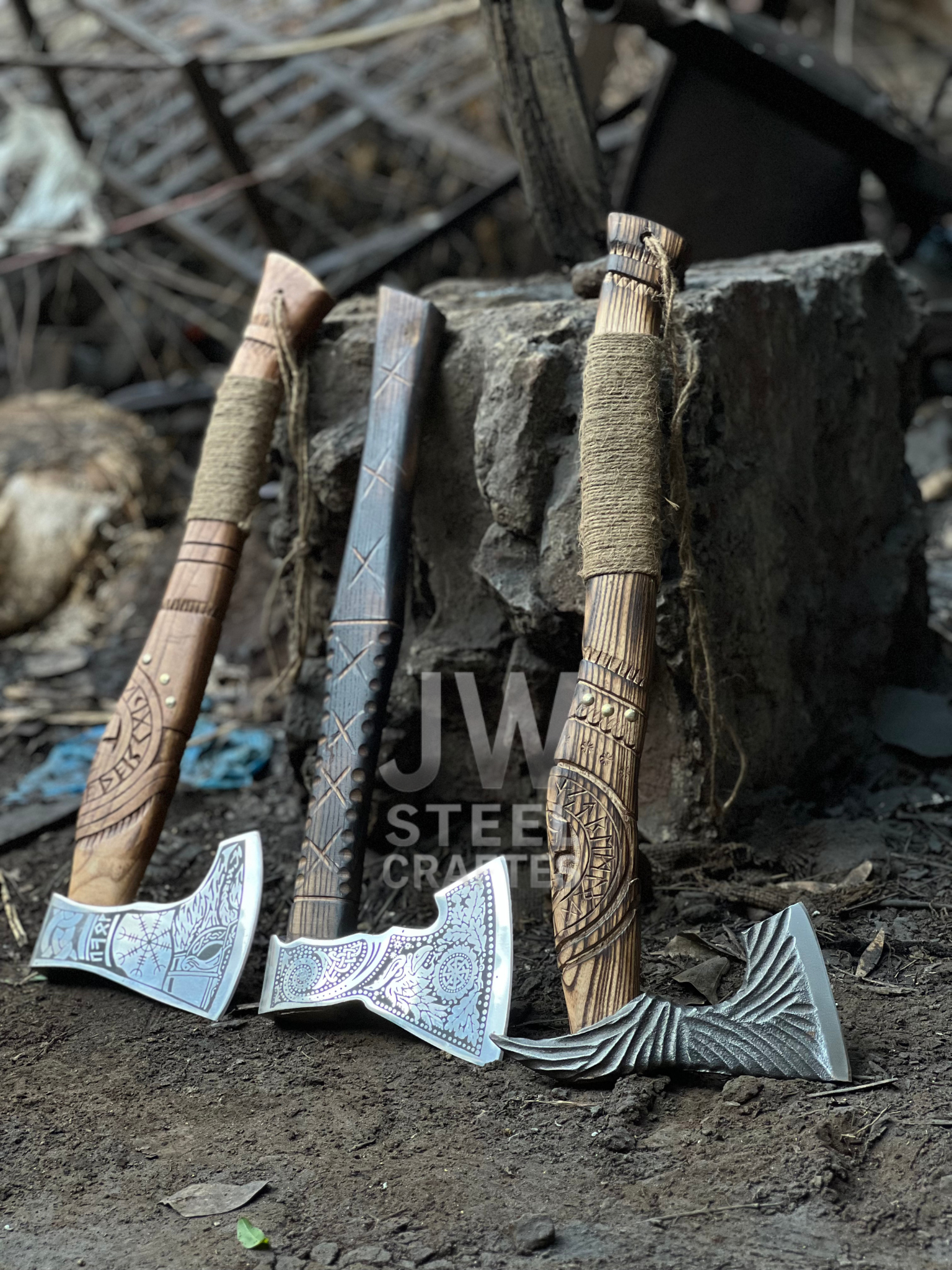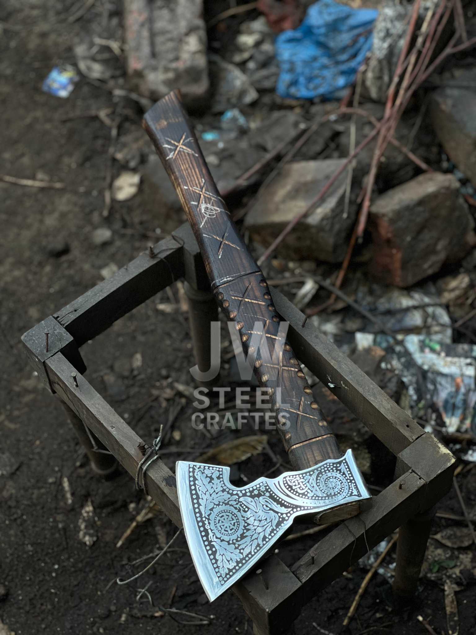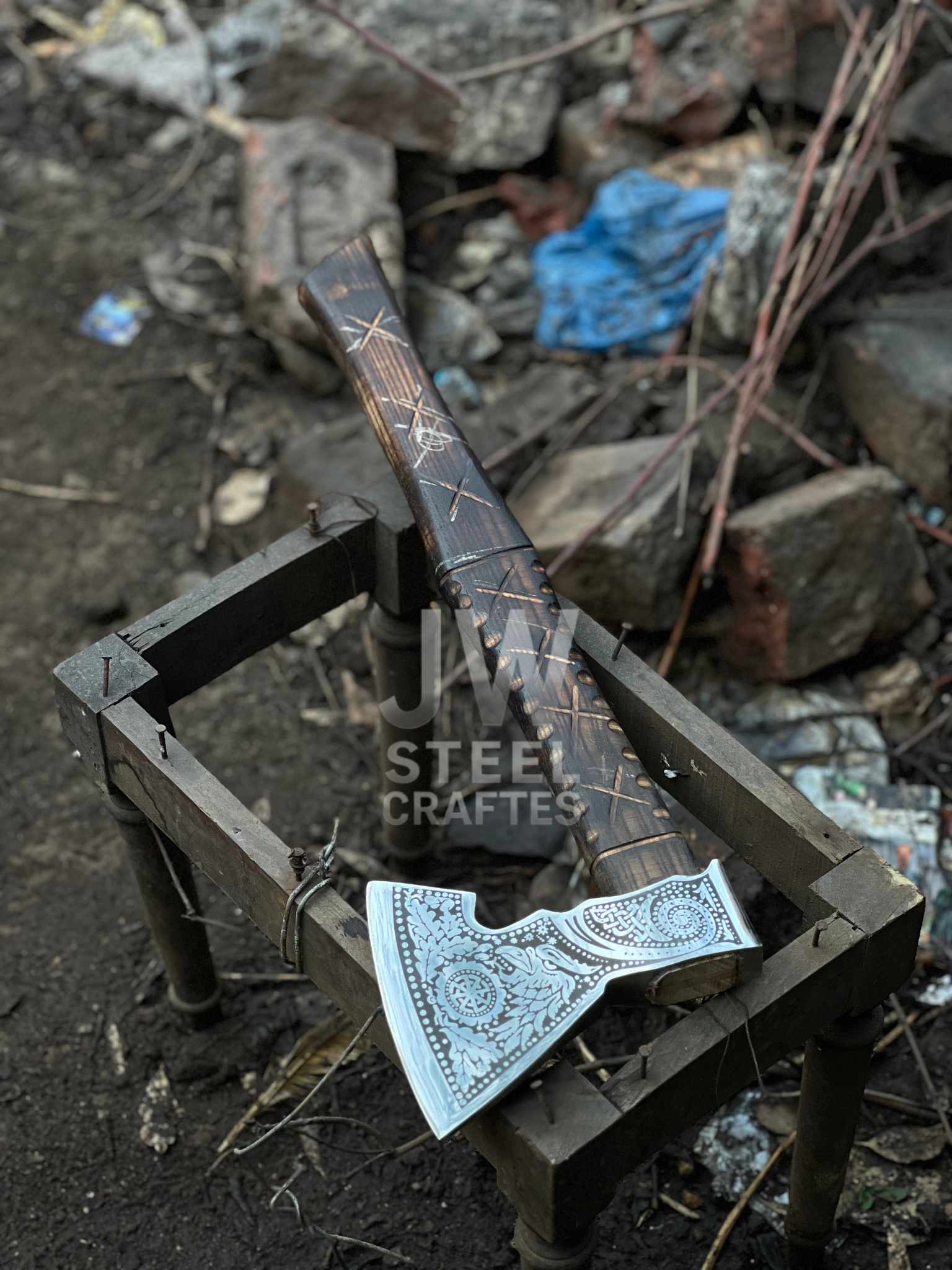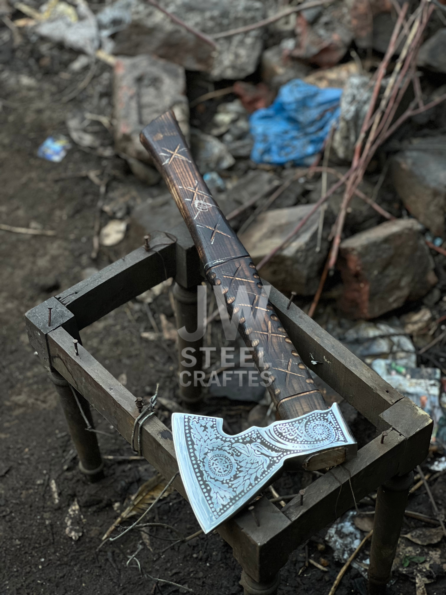 Experience the artistry of JW SteelCrafts with this Handmade Viking Axe. Featuring an engraved high-carbon steel axe head with intricate Norse-inspired patterns and a hand-carved wooden handle, this piece blends functionality with artistic heritage.