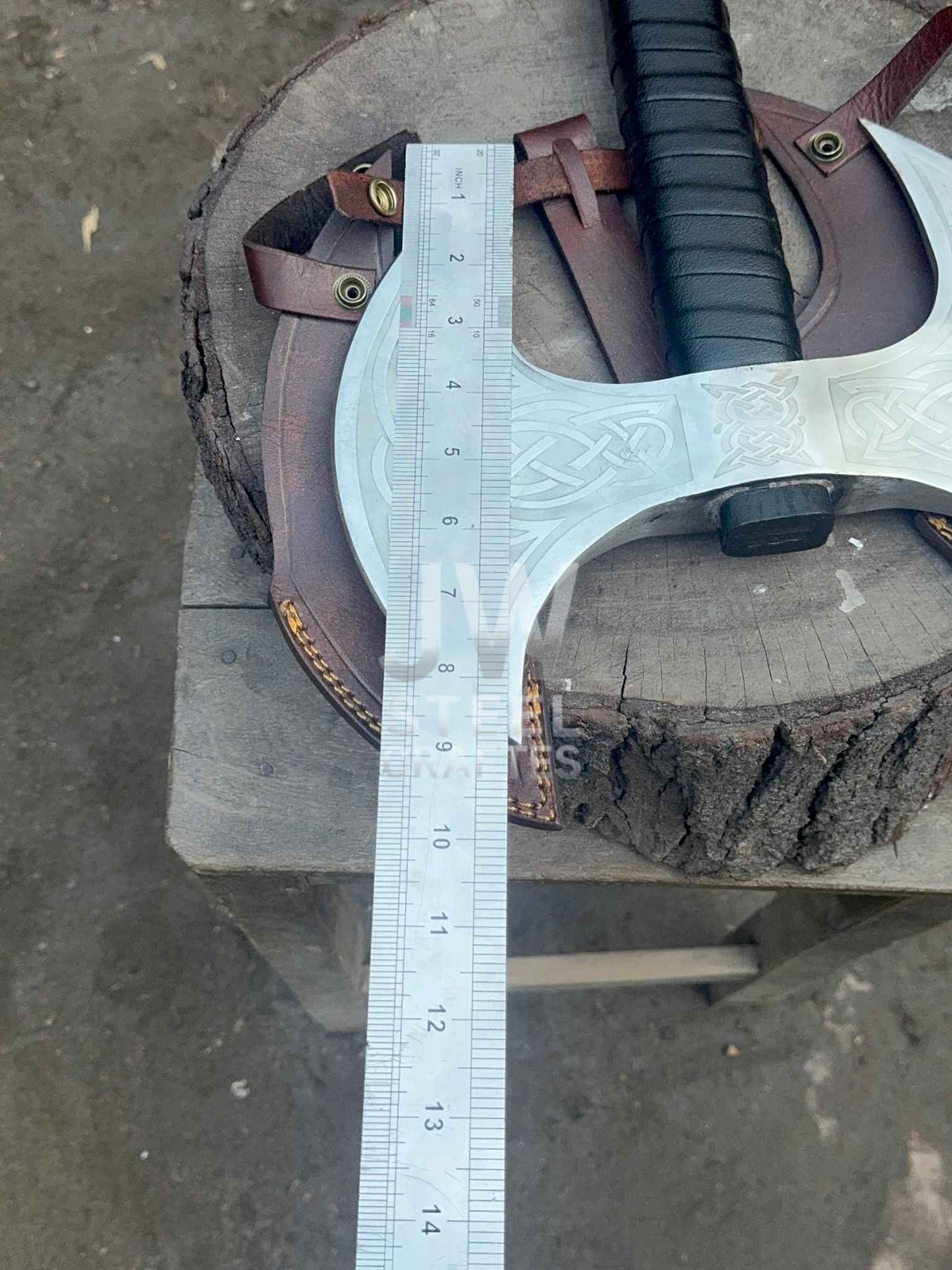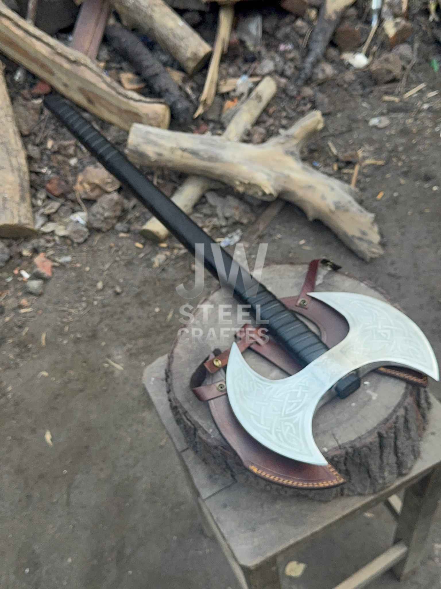 Crafted with a sturdy carbon steel blade, a strong hardwood handle wrapped in leather, and a handmade leather sheath, this battle axe blends durability with historical artistry. Perfect as a collectible, wall display, cosplay prop, or unique gift for Viking enthusiasts.
