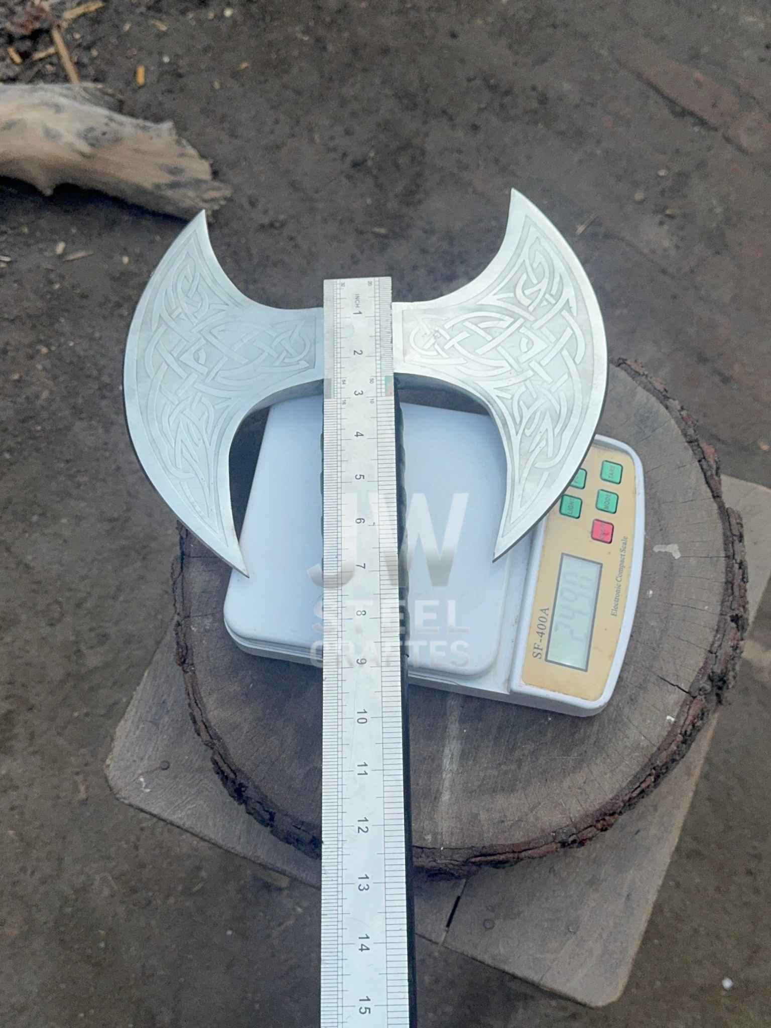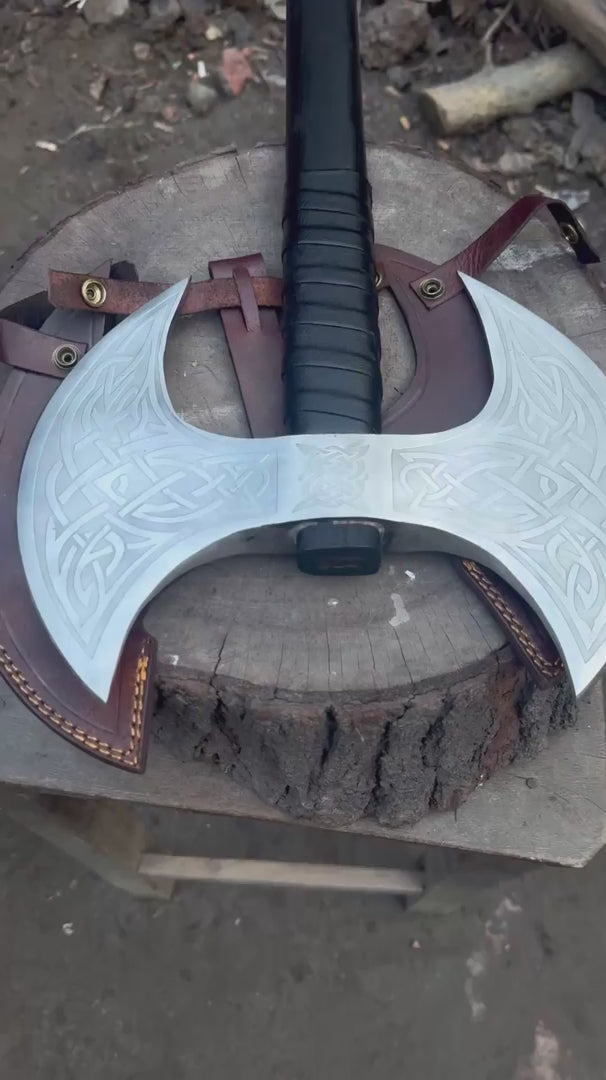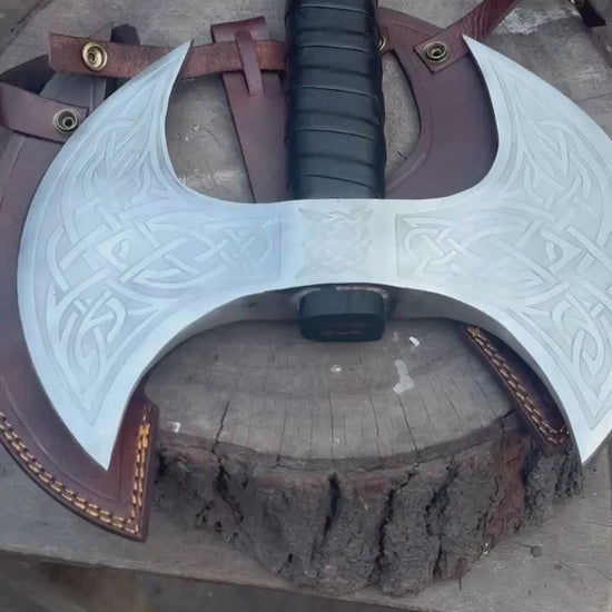 Handmade Viking Double-Headed Battle Axe – Custom Engraved Blade with Leather Sheath