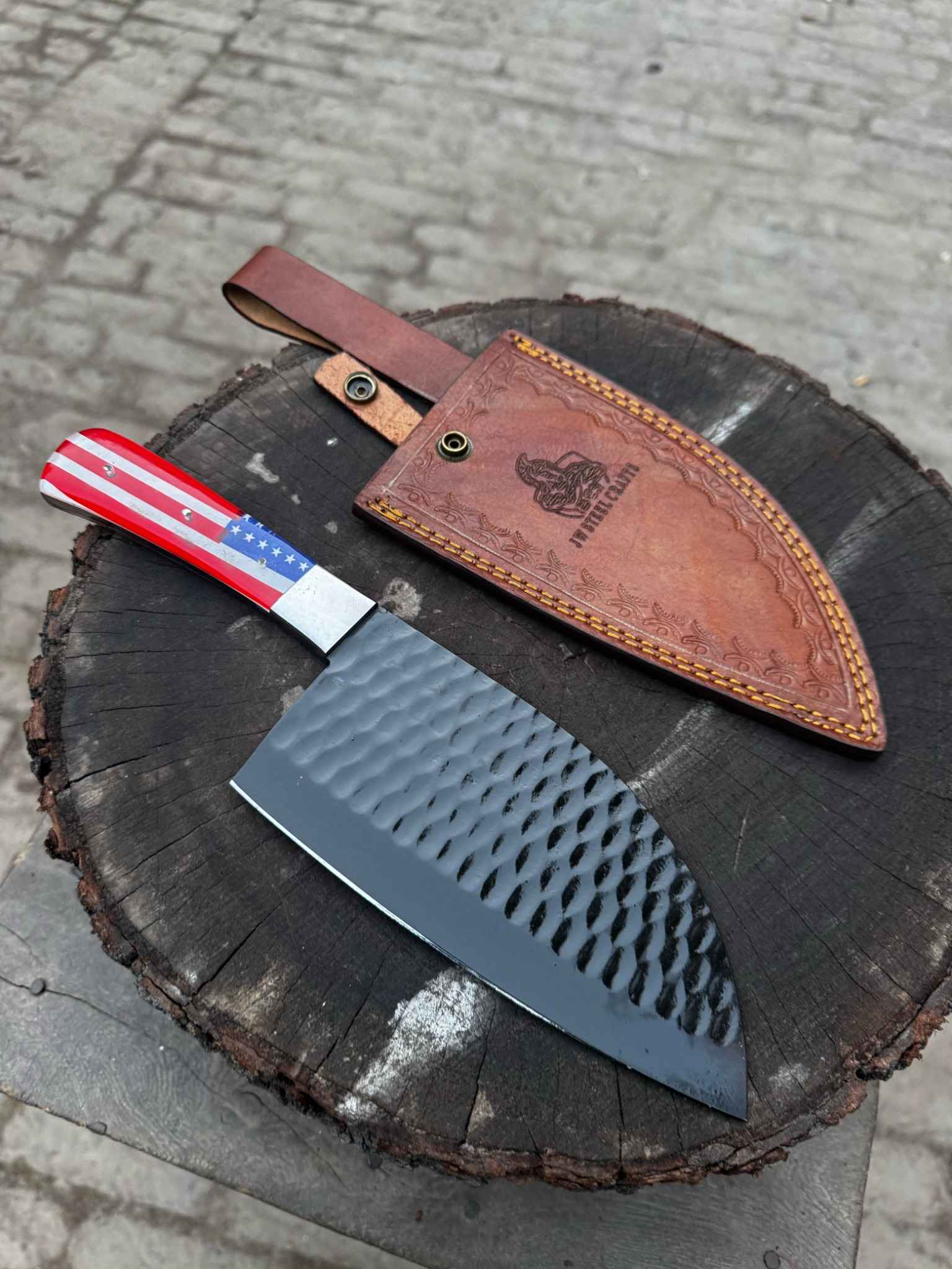 Bring power and pride to your collection with this Personalized American Flag Handle Chopper Knife. Hand-forged with a razor-sharp black powder-coated blade, this unique piece is built for durability, function, and display. Its bold American Flag handle makes it a standout—perfect for those who value artistry, tradition, and freedom.