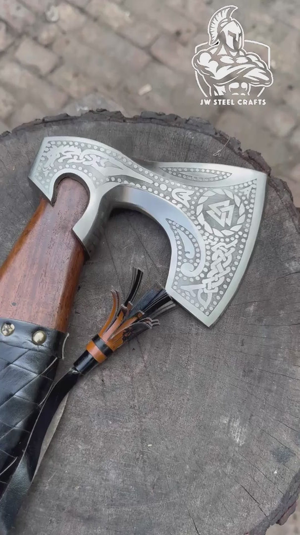 Discover the exquisite craftsmanship of the **Personalized Viking Axe Bearded Handcrafted Viking Battle Axe – Engraved Carbon Steel Blade with Wooden Handle With Leather Sheath** by JW SteelCrafts.