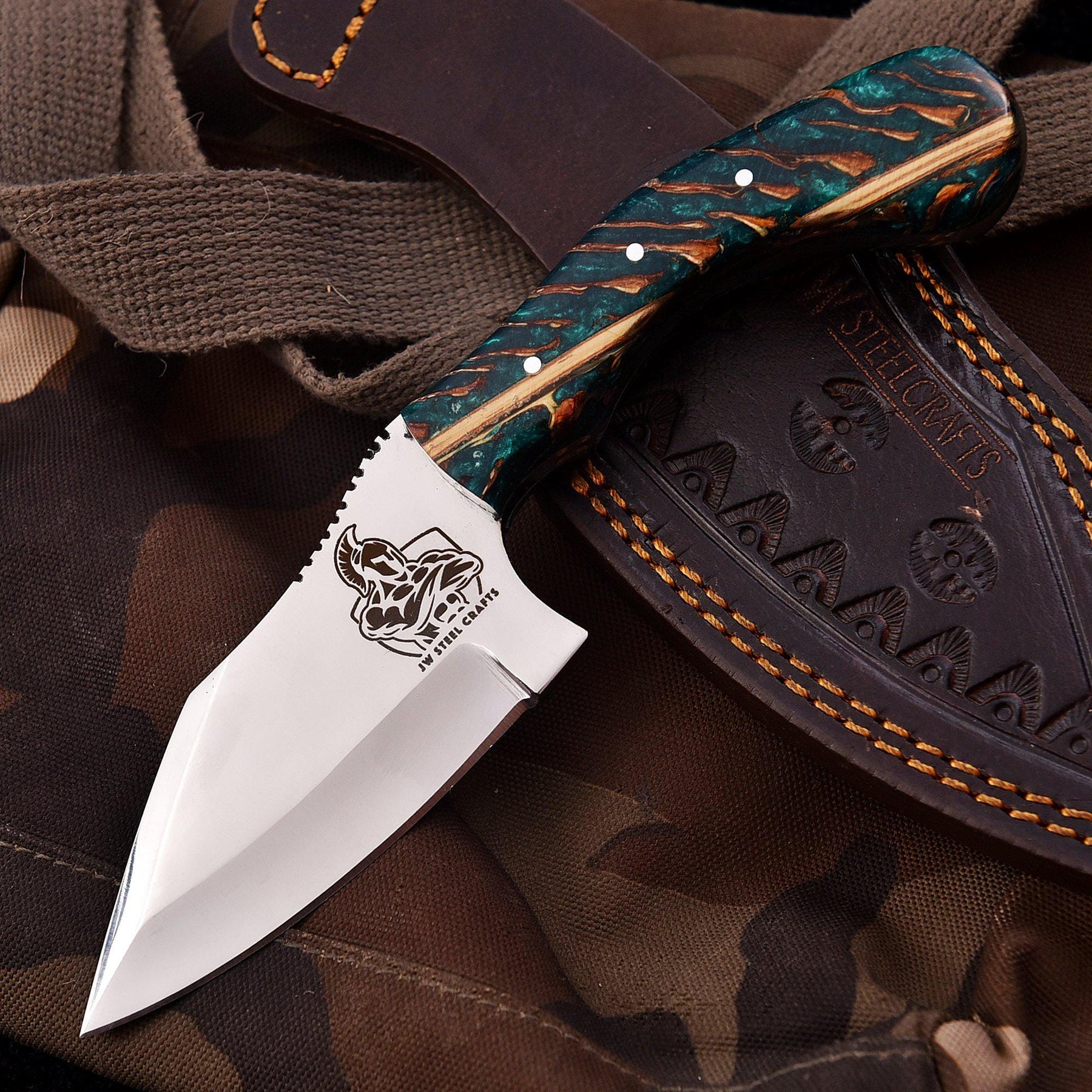 Collectors who enjoy unique handle materials often explore pieces such as the American flag Damascus utility knife, another example of handcrafted handle artistry within the JW SteelCrafts lineup.