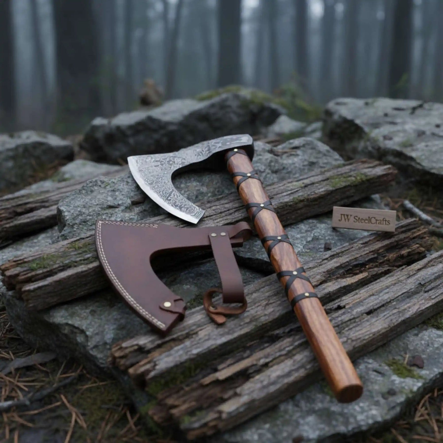 Every JW SteelCrafts Skeggøx is individually hand forged. No two blades share the same Damascus grain pattern. That is a guarantee of authentic craftsmanship. Add to Cart while this pattern is in stock. Each axe ships with a leather sheath and is ready for immediate outdoor or display use.